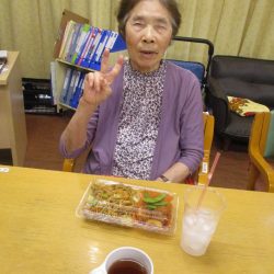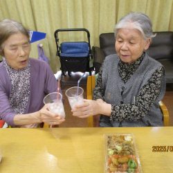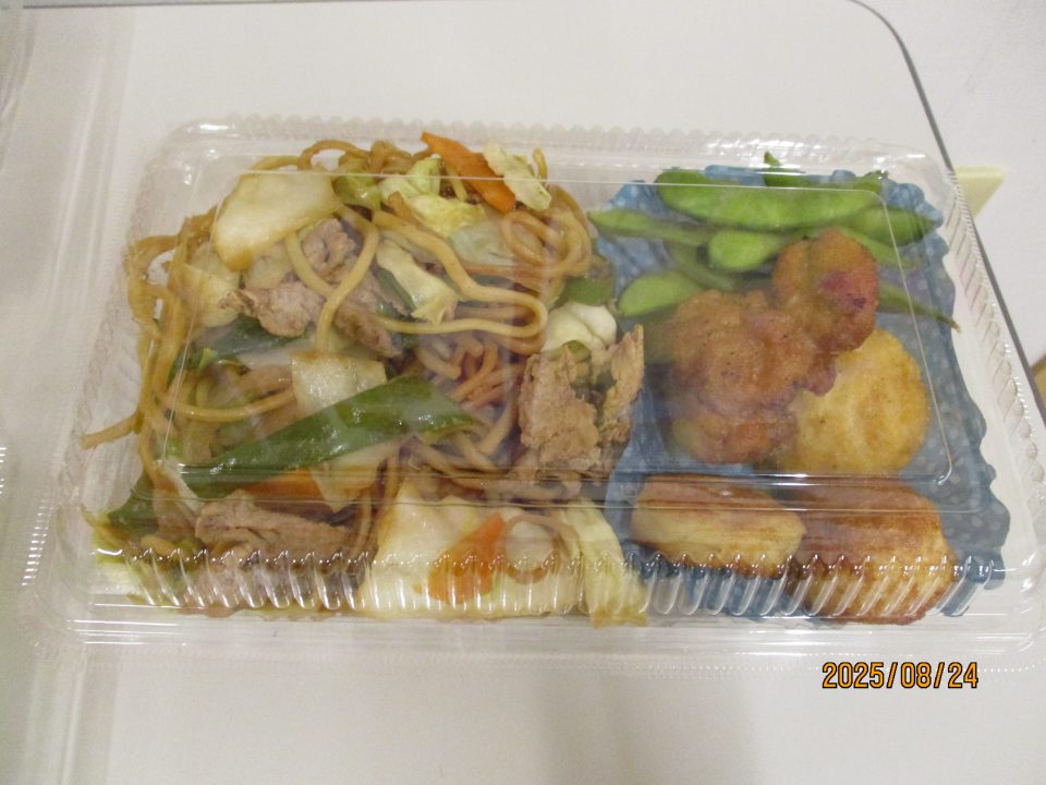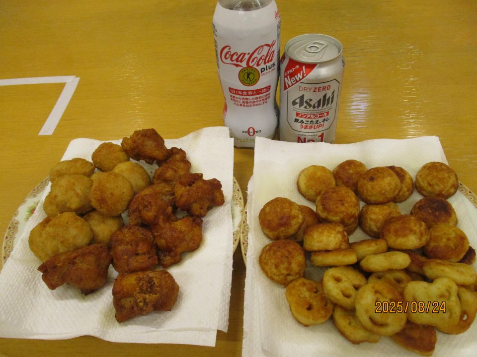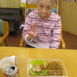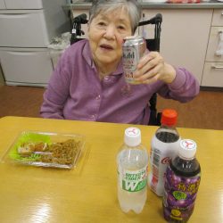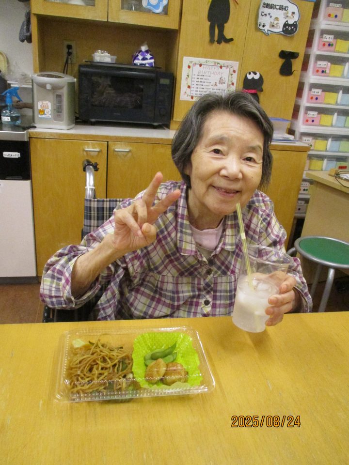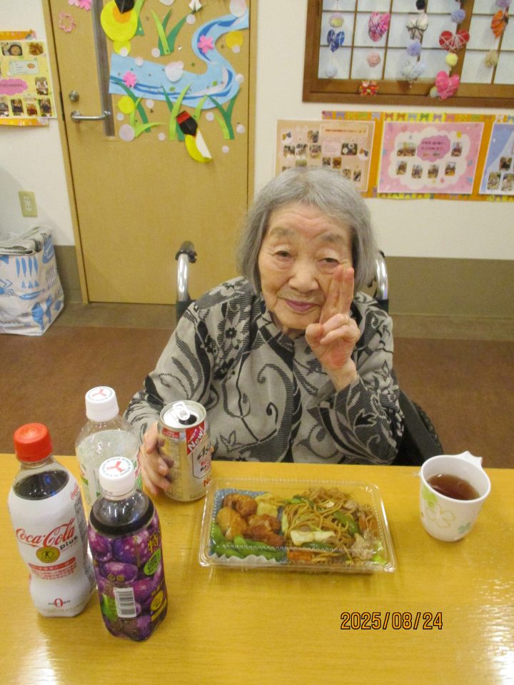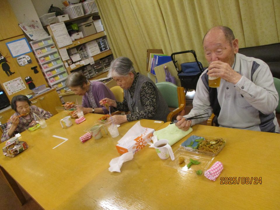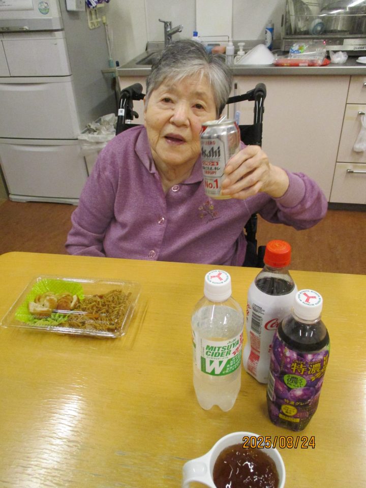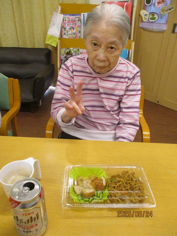 お祭りって昼間の最中か夜の花火かって感じでホームの皆様の体調等を考えて今年は近所の夏祭りには出かけなかったので、屋台の焼きそばのパック風に焼きそば弁当と炭酸ジュースやノンアルコールビールで乾杯しながらの食事会です。