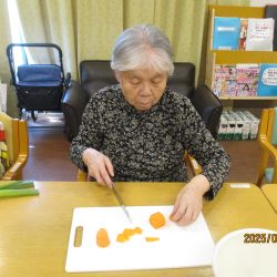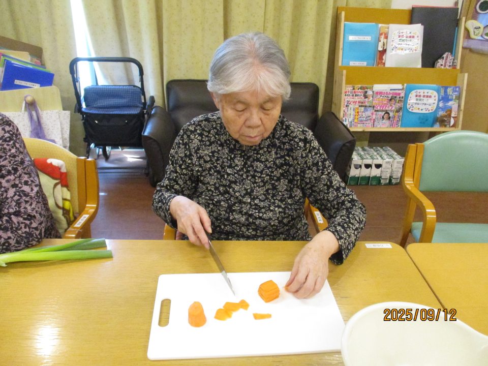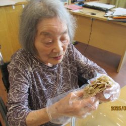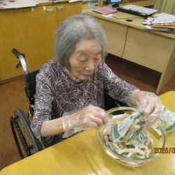 あまり調理レクに参加されない方にもレク参加のお誘い♥「できるかな?」と不安そうでしたが、きのこをちぎる、混ぜる作業を手伝ってくれましたよ