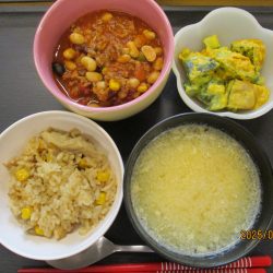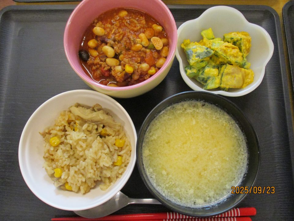 チリコンカン、南瓜ときゅうりのコロコロサラダ、豆腐と玉ねぎのスープ、とうもろこしと舞茸のピラフ