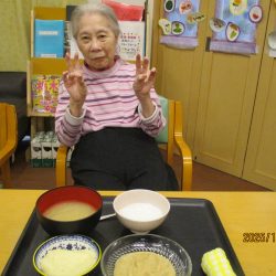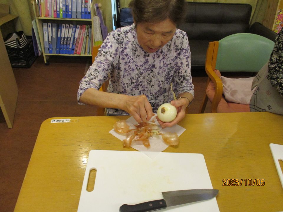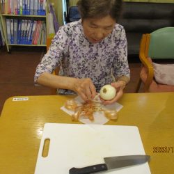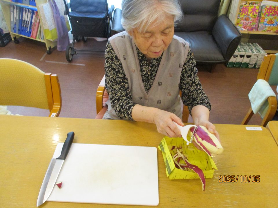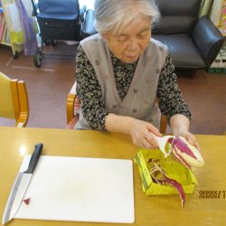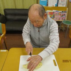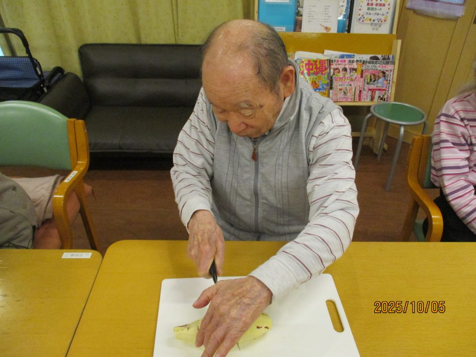 今日は硬いさつまいもをカットするのに、男性利用者さんの力を借りていきます