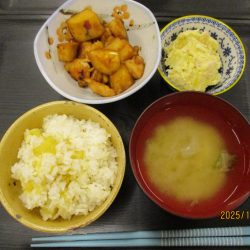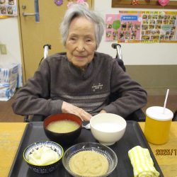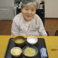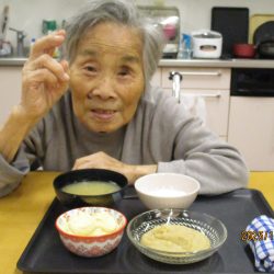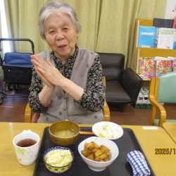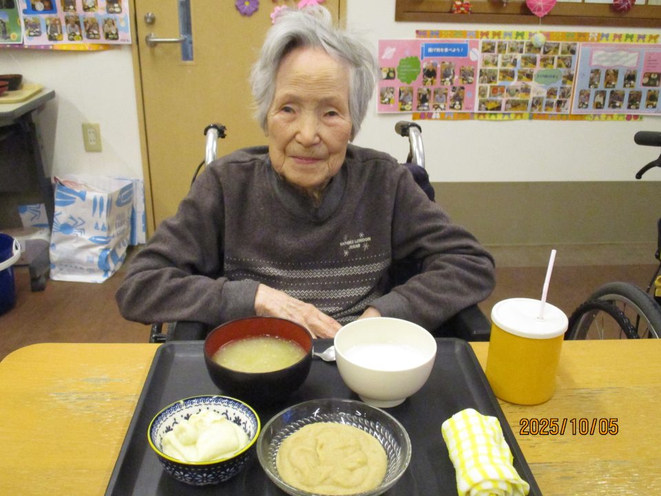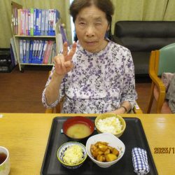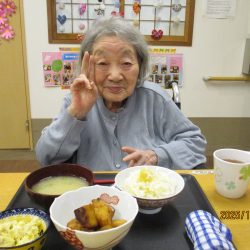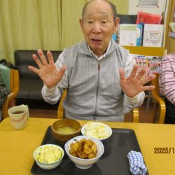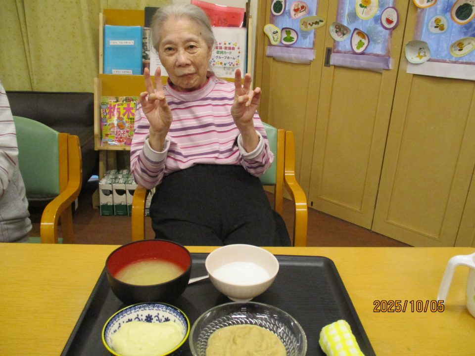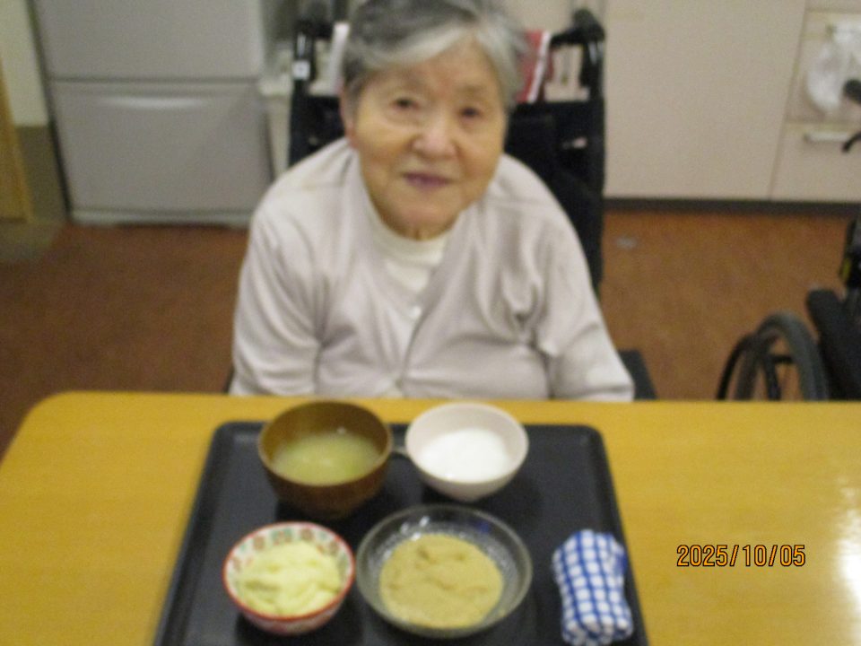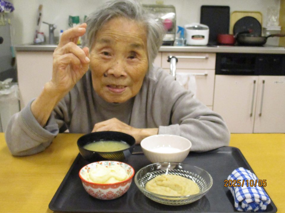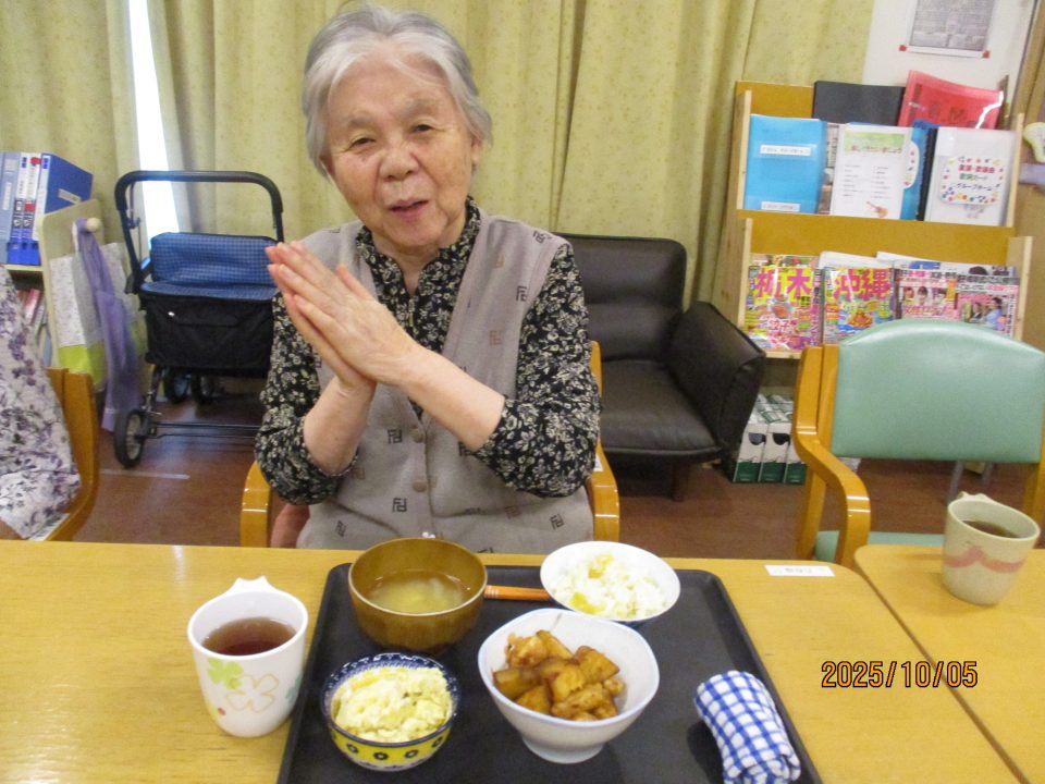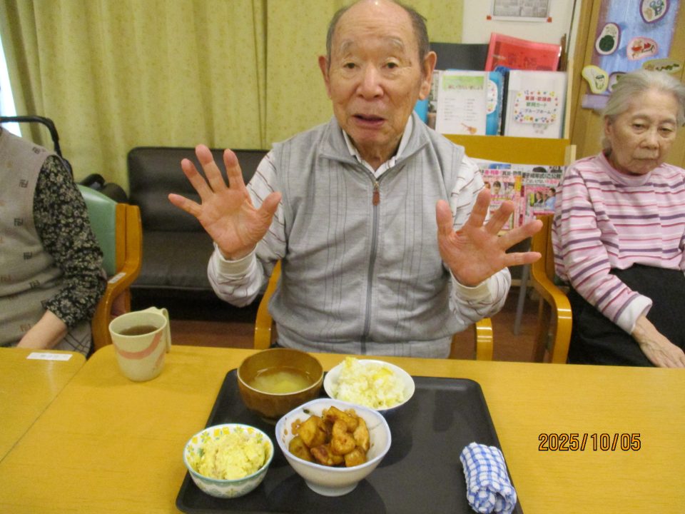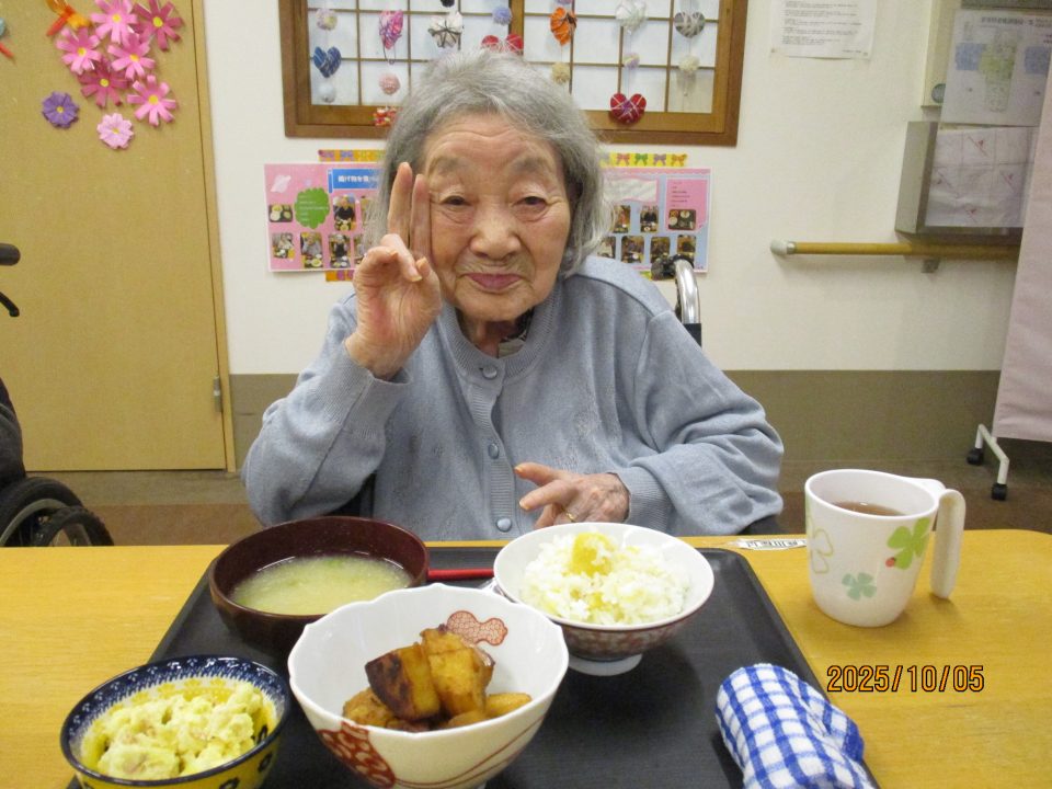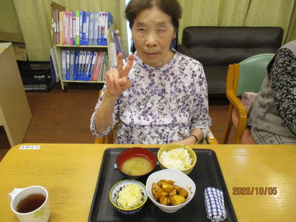 完成した昼食を前に「どれもこれもさつまいも入っとるね!」と嬉しそうなみなさん