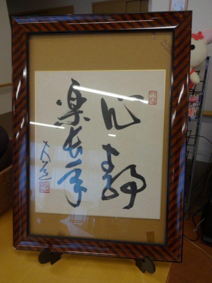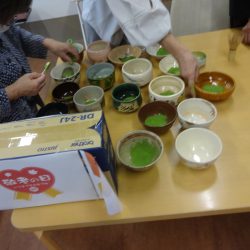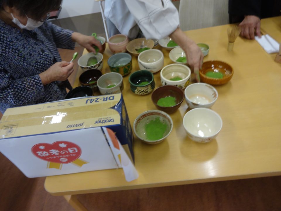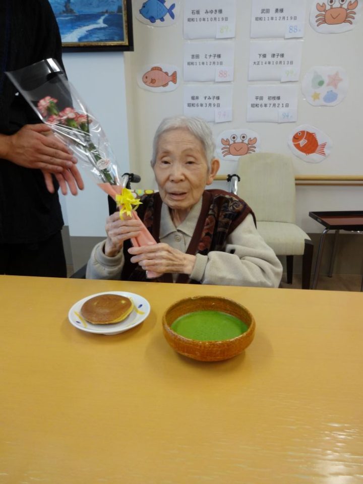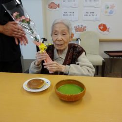 9月12日 利用者様の息子さんが裏千家の師範をされており、このたびご厚意でお抹茶を点てていただきました。 90歳、そして100歳を迎えられる利用者様のお祝いもしました。 すっきり飲みやすいお抹茶。そして「心静かに楽しく長寿を迎える」という京都の高僧の色紙の説明もしていただけ、職員も学びを得たひとときとなりました。