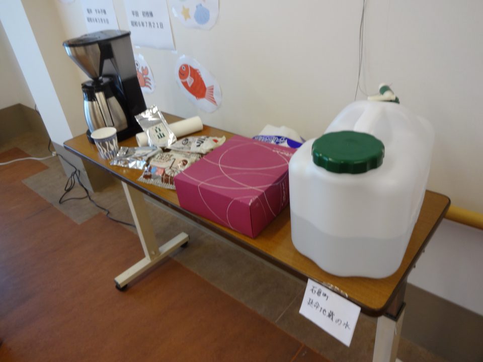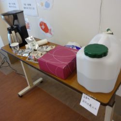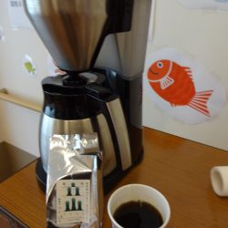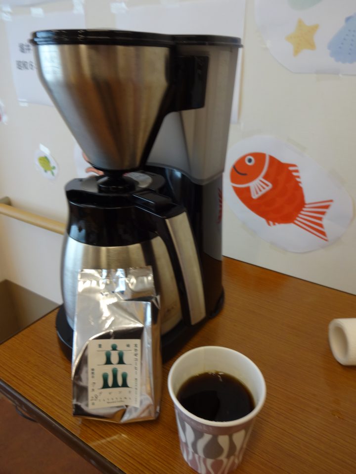 能登被災地支援でも活躍したコーヒーメーカーからは、共同スペースに良い香りが広がっていました。こちらは、一度に10杯分ほど淹れることができる優れモノです。
