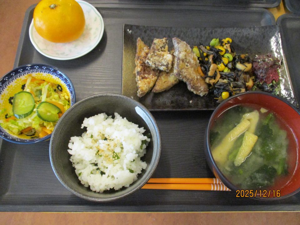 わかめご飯、味噌汁、鯨肉、レバーの竜田揚げ、塩もみキャベツ、ひじき煮、冷凍みかん