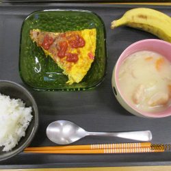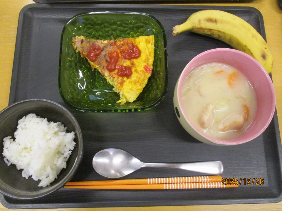 この日のメニューは、クリームシチュー、スペイン風オムレツ、デザートにバナナです。