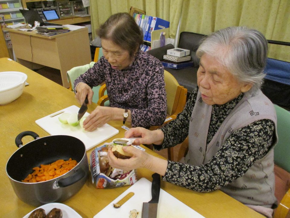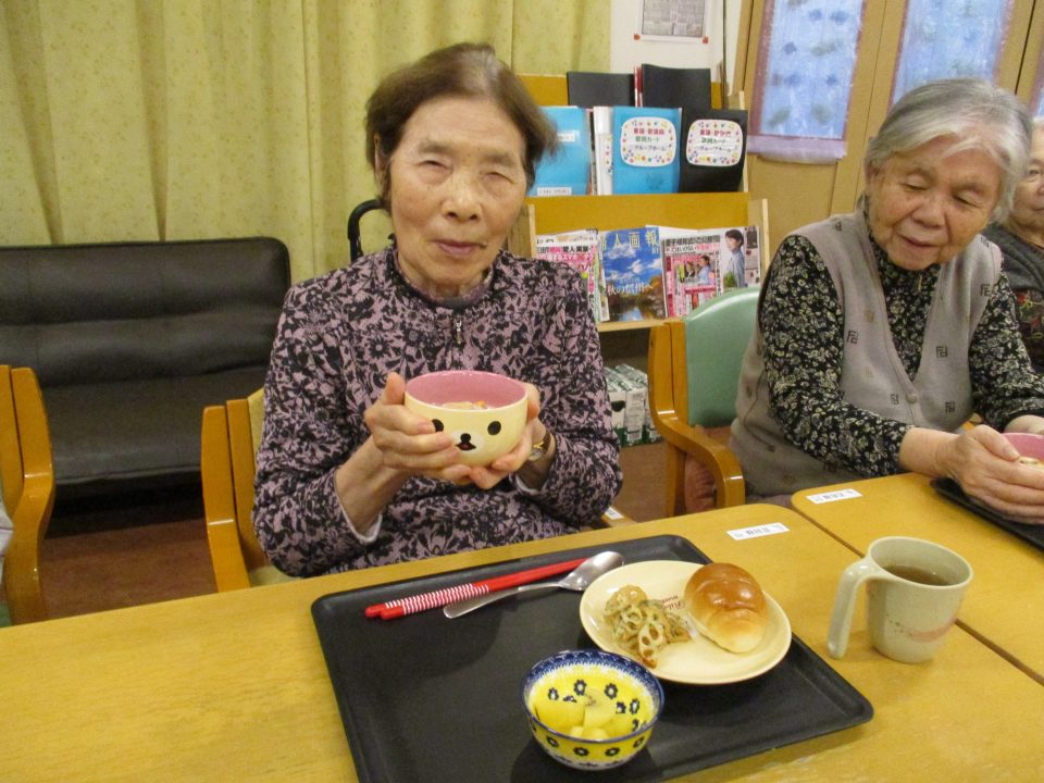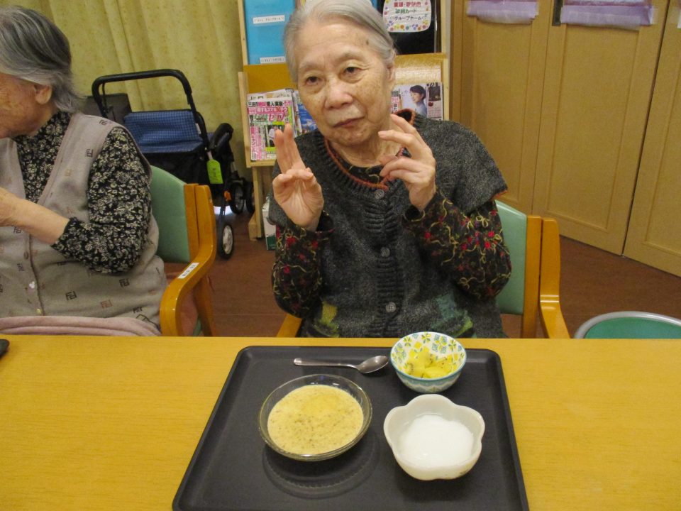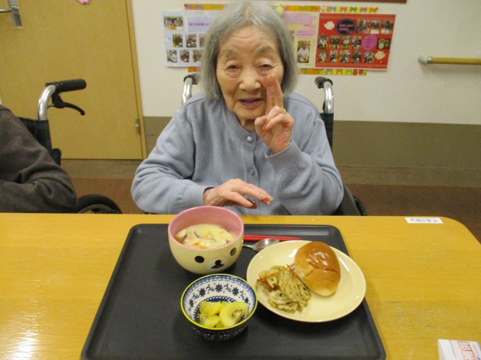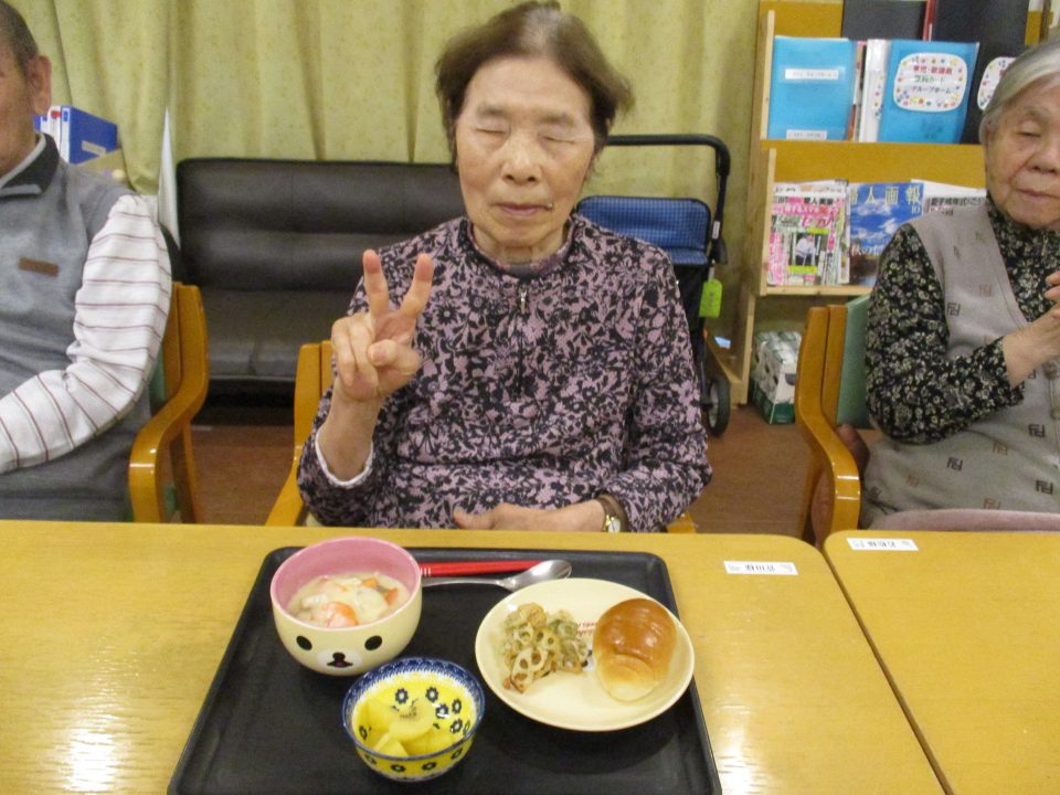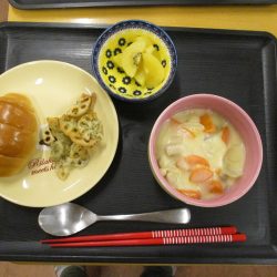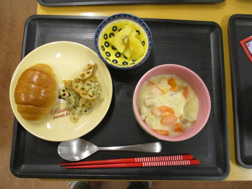 話をしながら調理が進みます。今回は主食をロールパンに変えてみました。たまにはパンも食べたいでしょう。牛乳がたっぷり入ったシチューに浸しても美味しいですね。食べ方は自由ですよ~。当然だけどさつまいもはホクホクであま~い優しい味❤