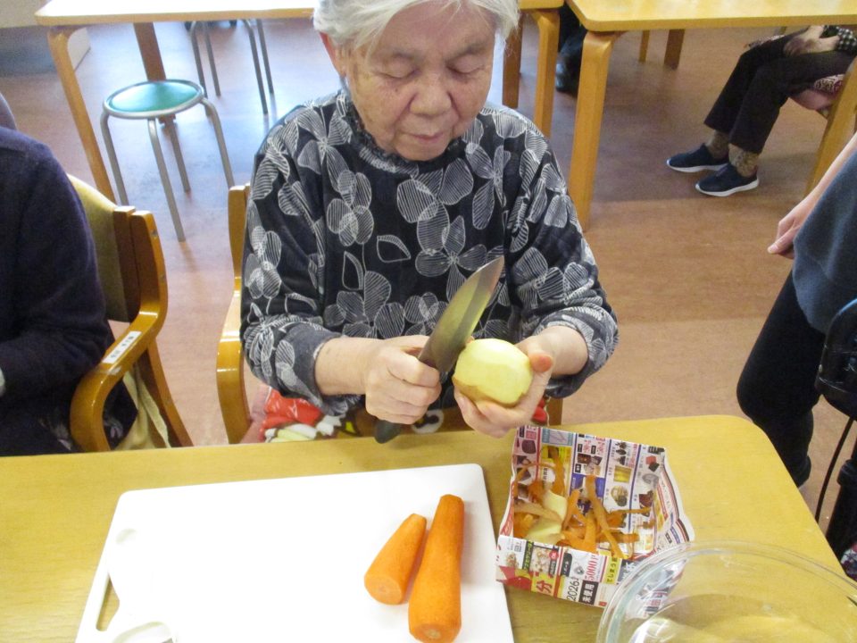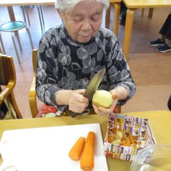 野菜を切るところを利用者さんにお願いしながら、「お家で肉じゃがを作る時は、どんなふうに切ってました?」と聞いてみると、「肉じゃがは作ったことないねぇ」とニコリ。☺️