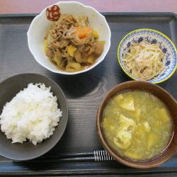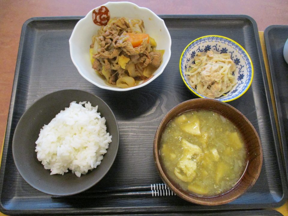今日のメニューは、肉じゃがと、もやしとツナのマヨポンサラダ、お味噌汁は揚げと、とろろ昆布。