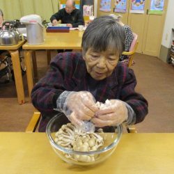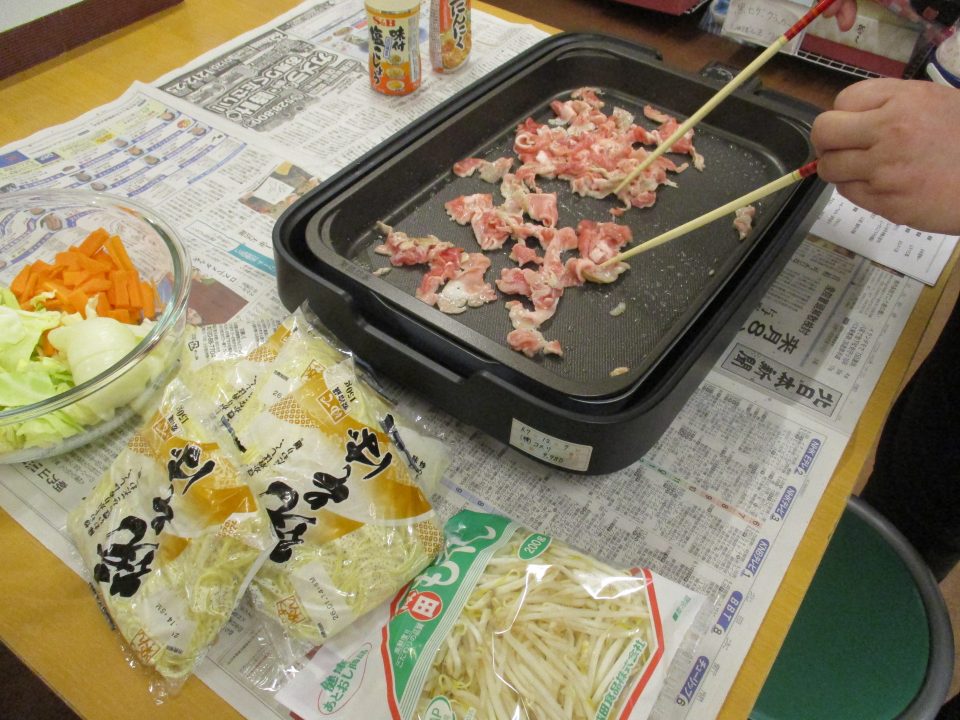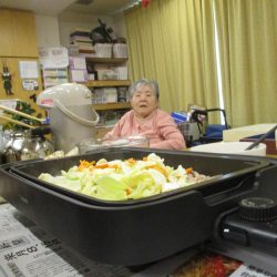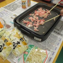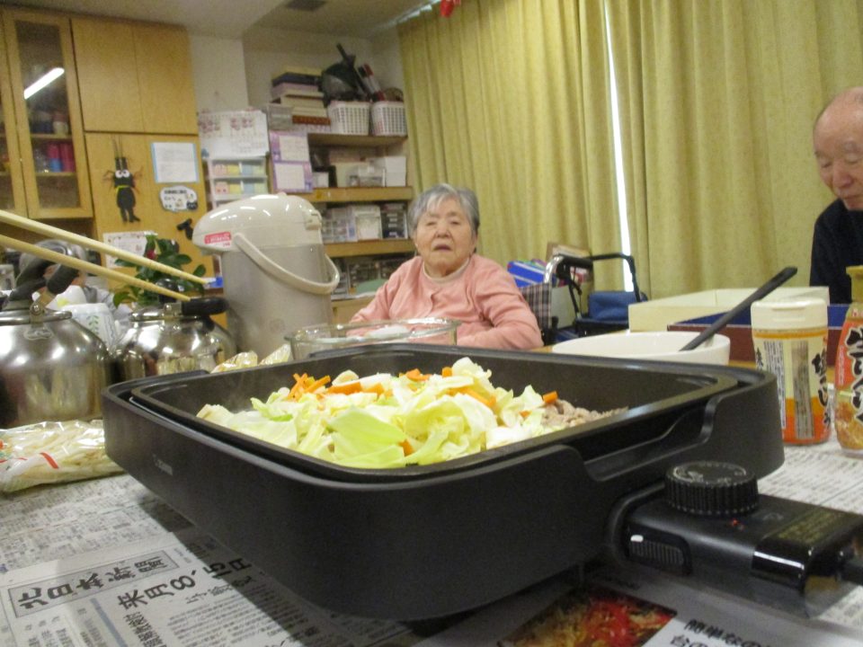 ジュージューという美味しそうな音と香ばしい香りがしてくると、「何できるが?」「お腹空いたわ」とホットプレートをのぞきに来る方が絶えません😆