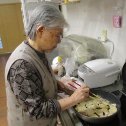 「こうでいい?」と確認しながらお肉に粉をまぶしてくださるAさん。