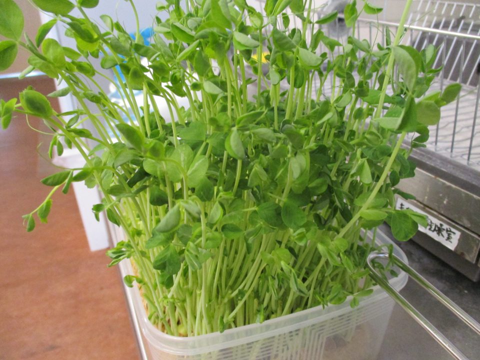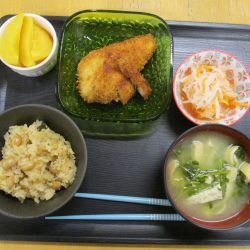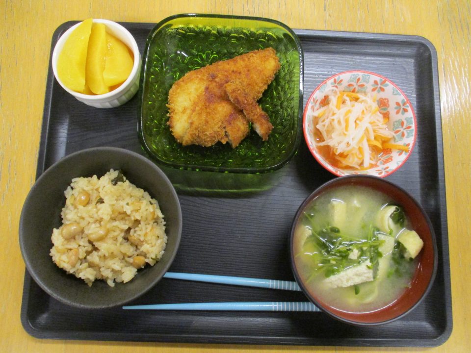 〈メニュー〉・豆ごはん ・アジフライ ・なます ・豆苗と揚げの味噌汁 ・桃缶