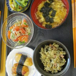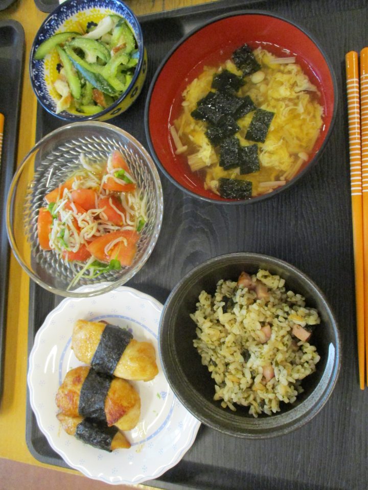 ⭐メニュー⭐海苔の炊き込みご飯、海苔のすまし汁、鶏むねのり巻き、きゅうりとちくわのサラダ、しらすとトマトのマリネ