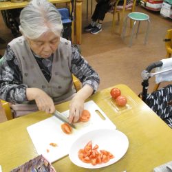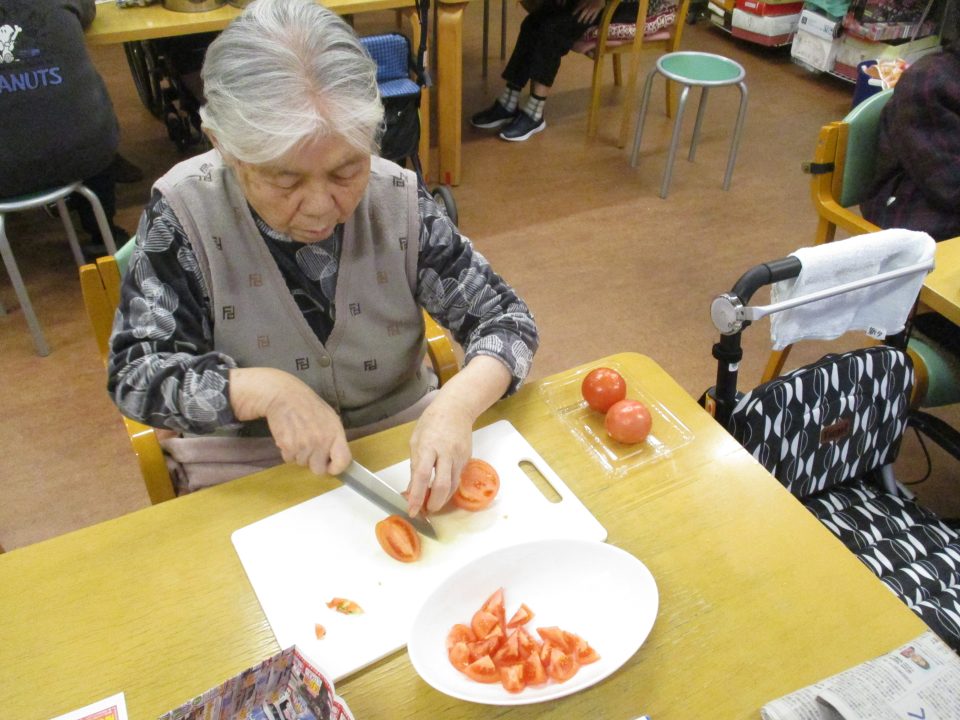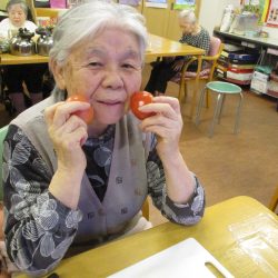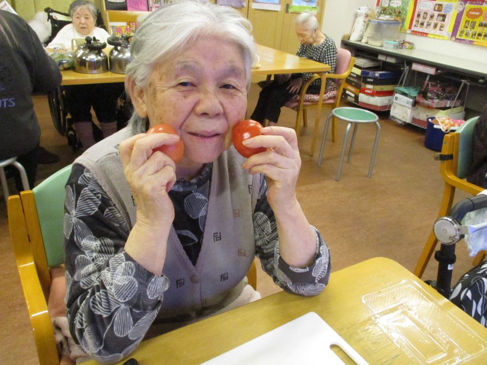 途中カットする手を止めて、赤くて可愛いトマトと記念撮影です🍅にっこり☺️