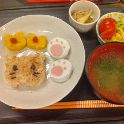 😸メニュー😸猫型ねこまんまおにぎり、肉球はんぺん、コールスロー、きのこソテー、猫型ナゲット