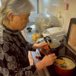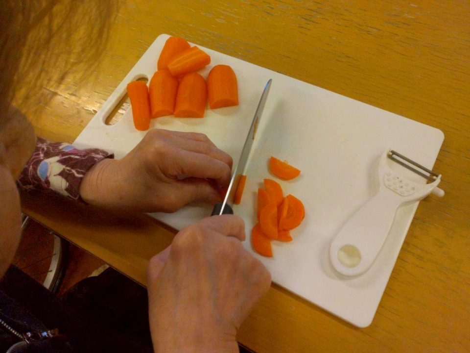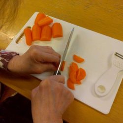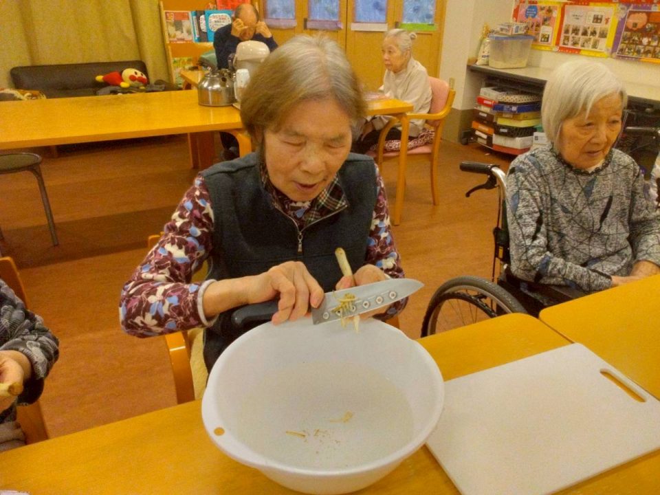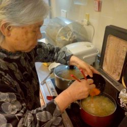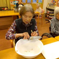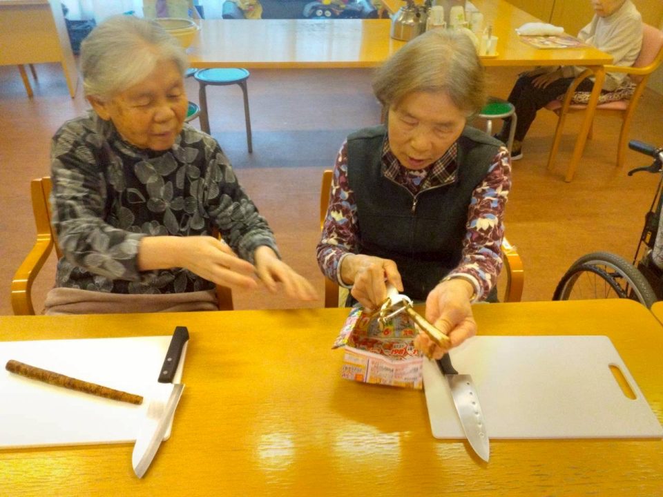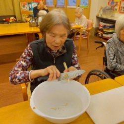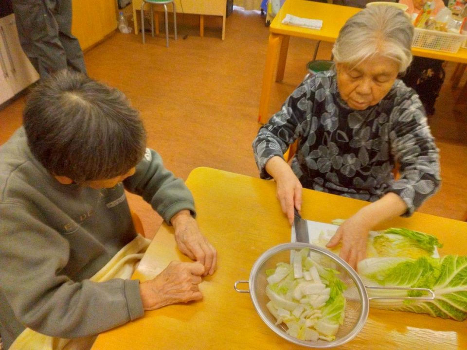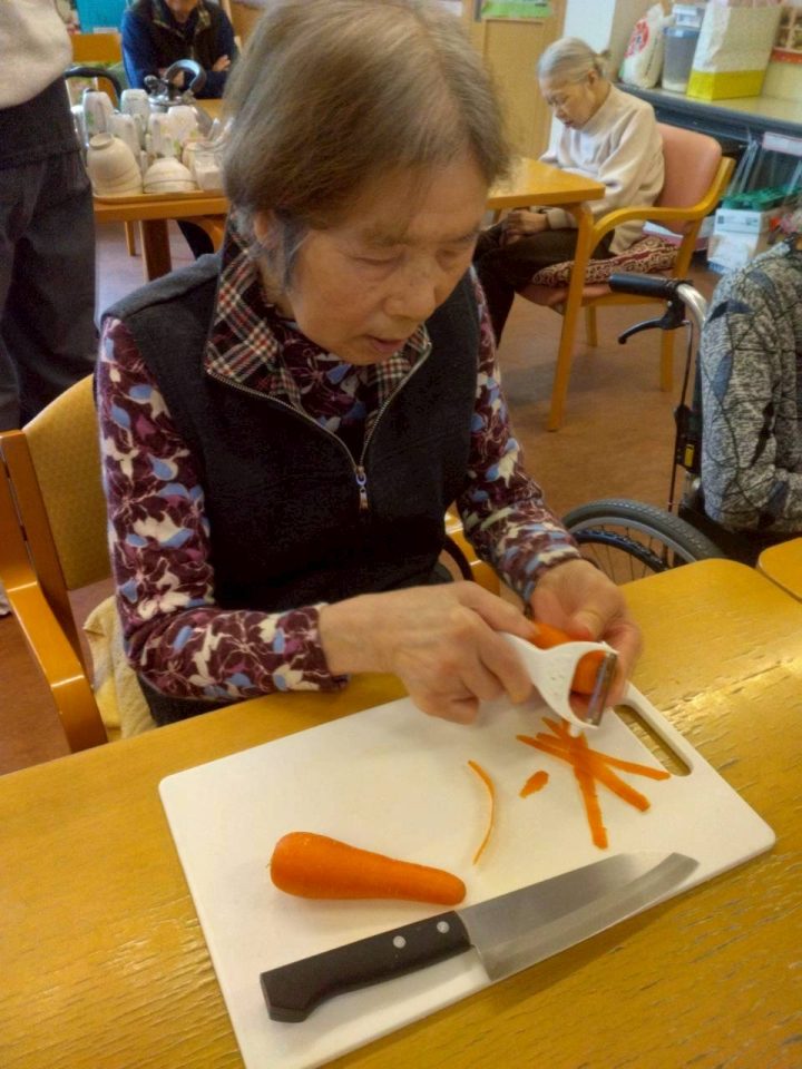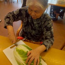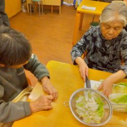 みずみずしい白菜と豚肉、彩りに人参を加えて無水料理にしましたよ。中火でとろとろほったらかしです。それで充分!ちゃんと煮汁が浸るくらい出てきて美味しく仕上がりますよ。カボチャは利用者の皆さんが大好きでサラダにしようか甘く煮ようかと悩んだ挙句、甘煮に変更しました。甘煮は鉄板メニューの一つです。“あの人が完食してくださるメニューは絶対にリピートしたい一品”になっています。