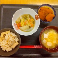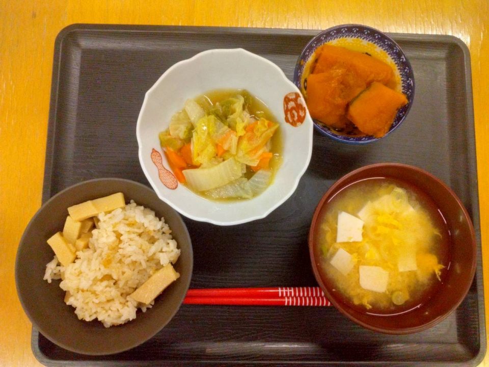 ・白菜と豚肉のとろとろ煮 ・カボチャの甘煮 ・卵と豆腐の味噌汁