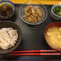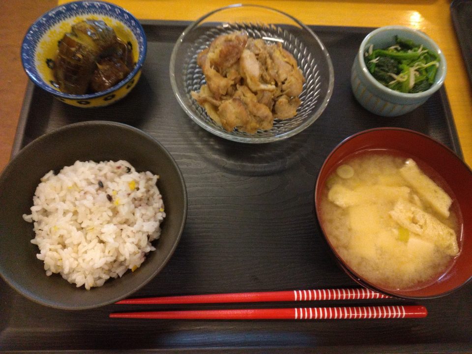 🌾メニュー🌾雑穀米、豆腐と揚げの味噌汁、豚の西京焼き、茄子の煮浸し、ほうれん草としらすのお浸し