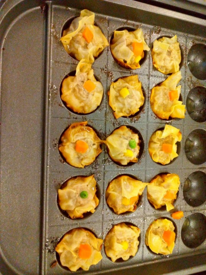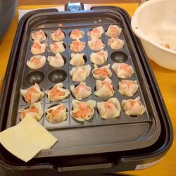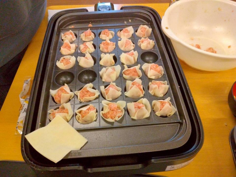 シュウマイは包むのが難しいので、今回はたこ焼き器のくぼみを使って、簡単に丸く作る方法に😏