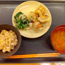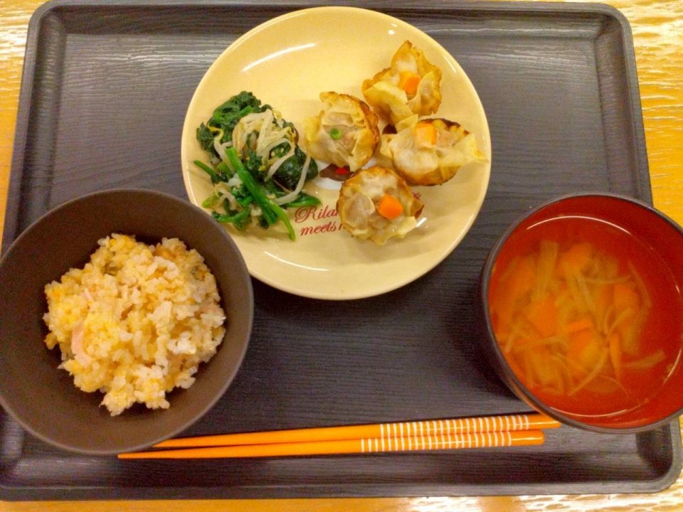 〇焼きシュウマイ、玉ねぎと人参の中華スープ、炊飯器でチャーハン、ほうれん草のナムル😋