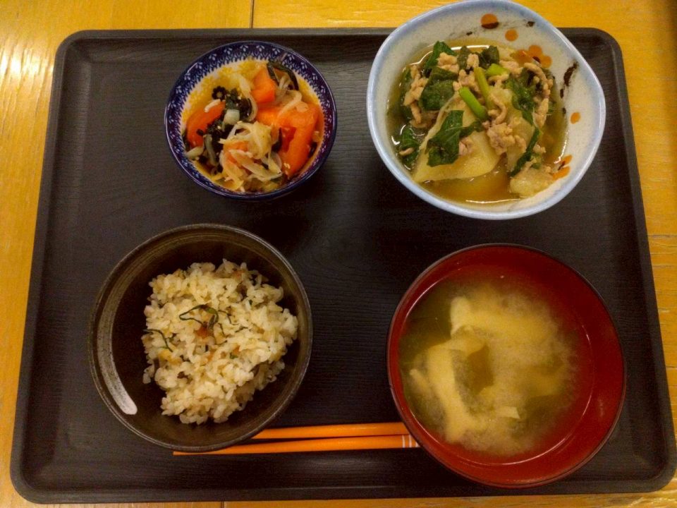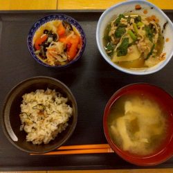 🌸メニュー🌸梅塩こんぶの炊込みご飯、味噌汁、新玉ねぎのサラダ、カブのひき肉あんかけ