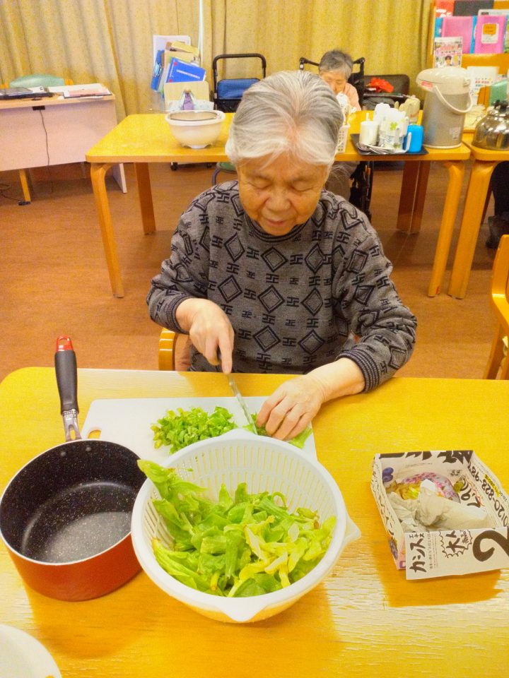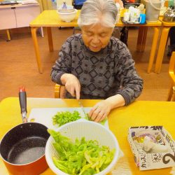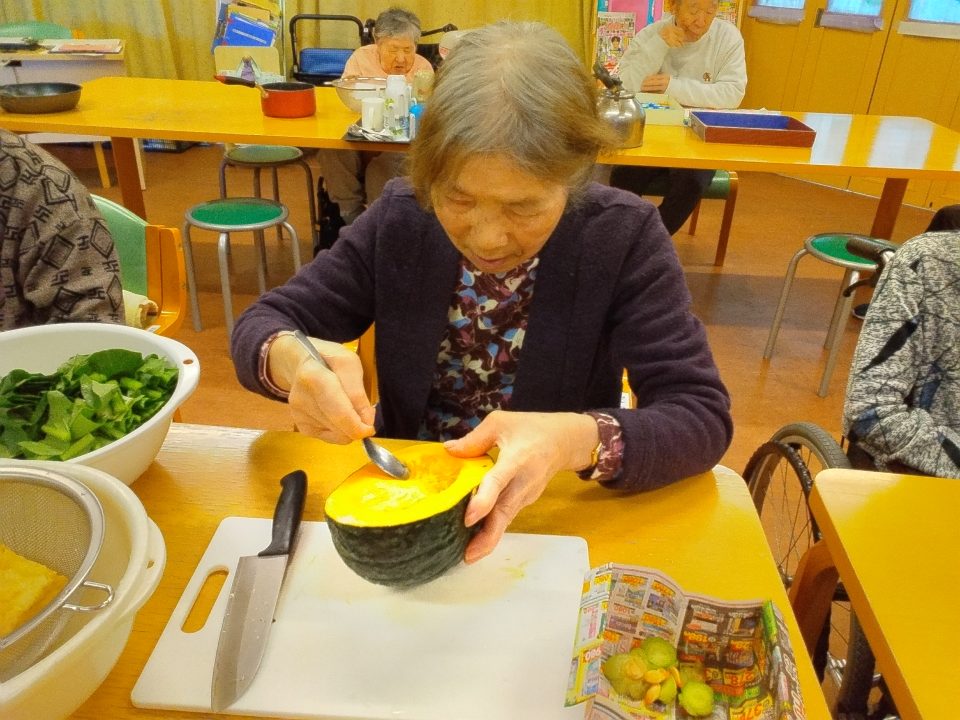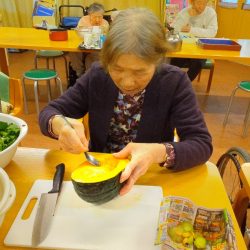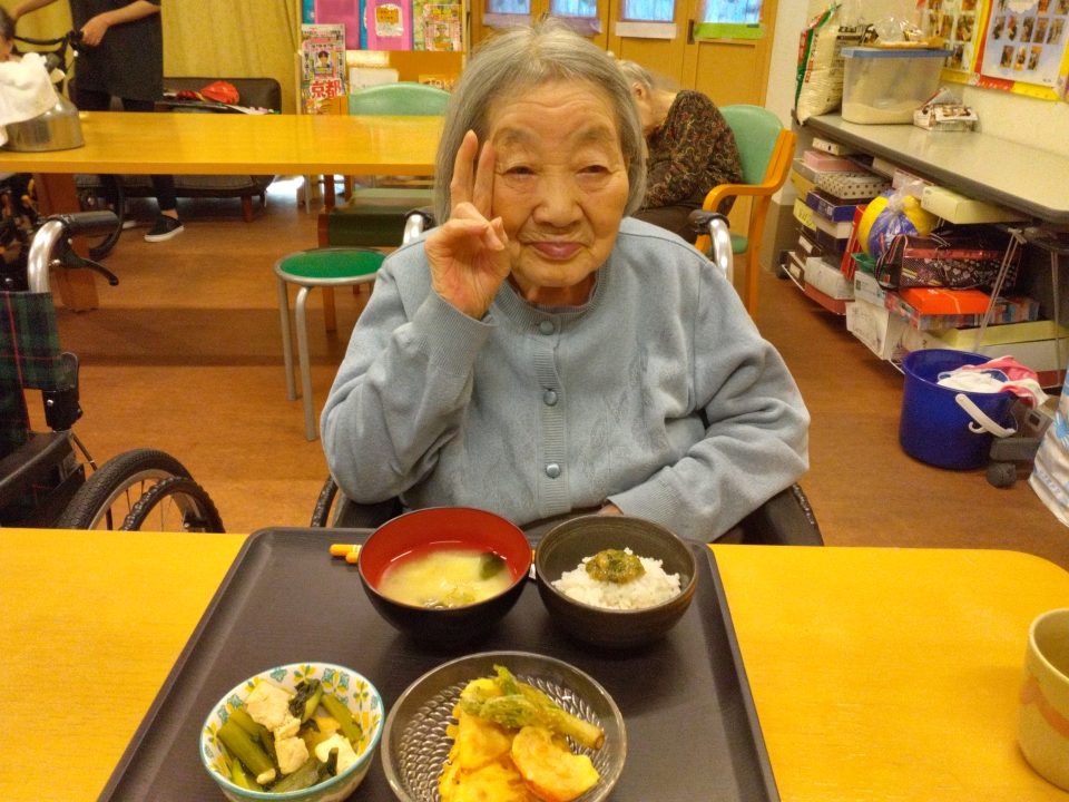 「あら~、珍しい。どこに生えとったがけ~?」と、Aさんと職員の会話。「最近ではそこらへんに生えていないのですよ。JAで地場もんのふきのとうを買ってきました!高級品ですよ!」「ウチ行けばそこらじゅうに生えとるちゃ。取ってこられ~」