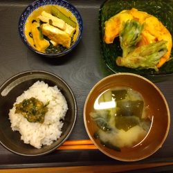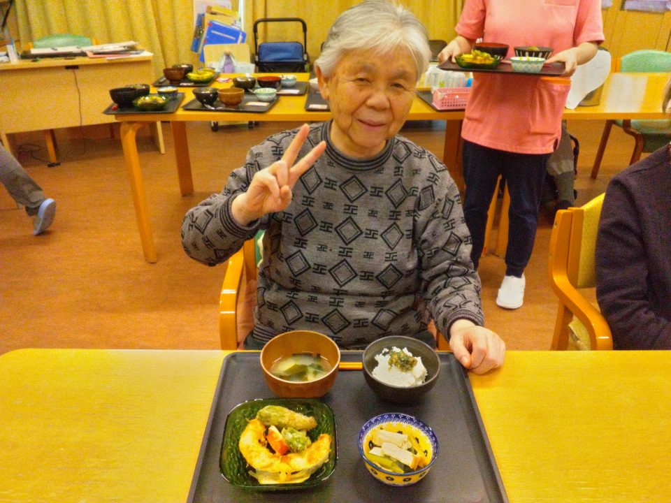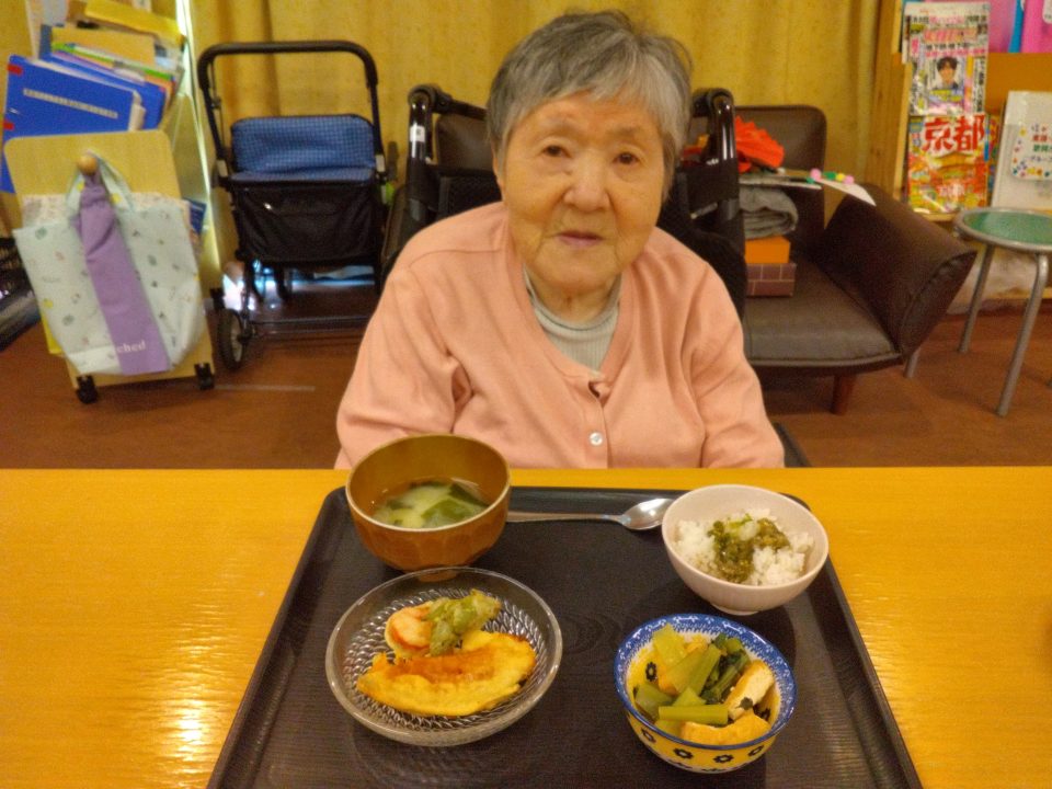 ・ご飯(ふきのとう味噌添え) ・天ぷら(ふきのとう、南瓜、渦巻きかまぼこ)